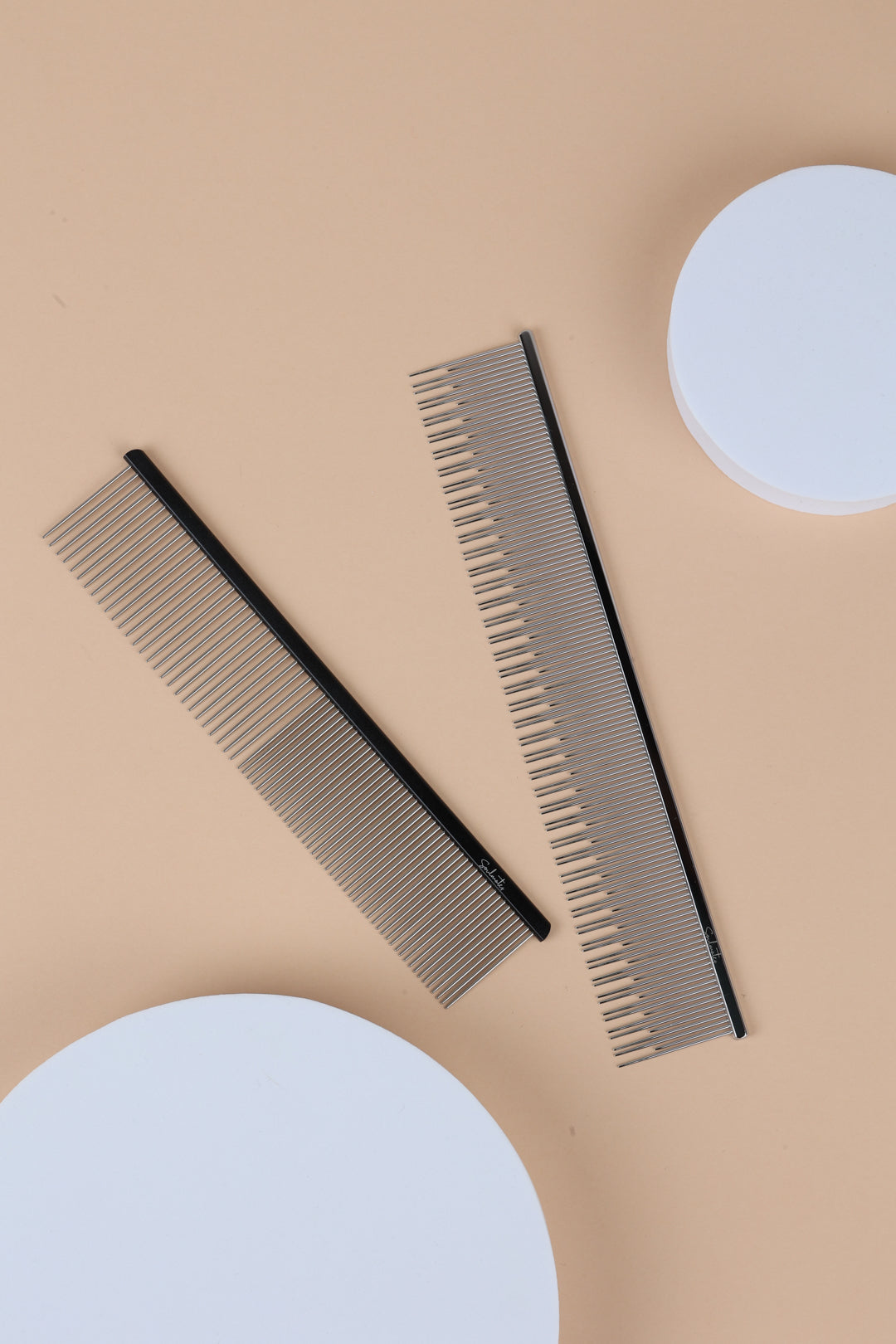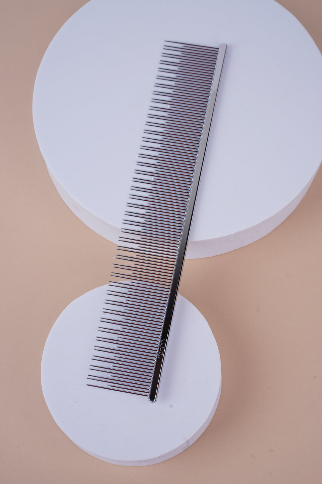 This grooming comb is engineered to be ultra-lightweight yet exceptionally durable, crafted with a sturdy aluminium body and flexible stainless-steel teeth arranged in a balanced 50/50 split of wide and fine spacing.