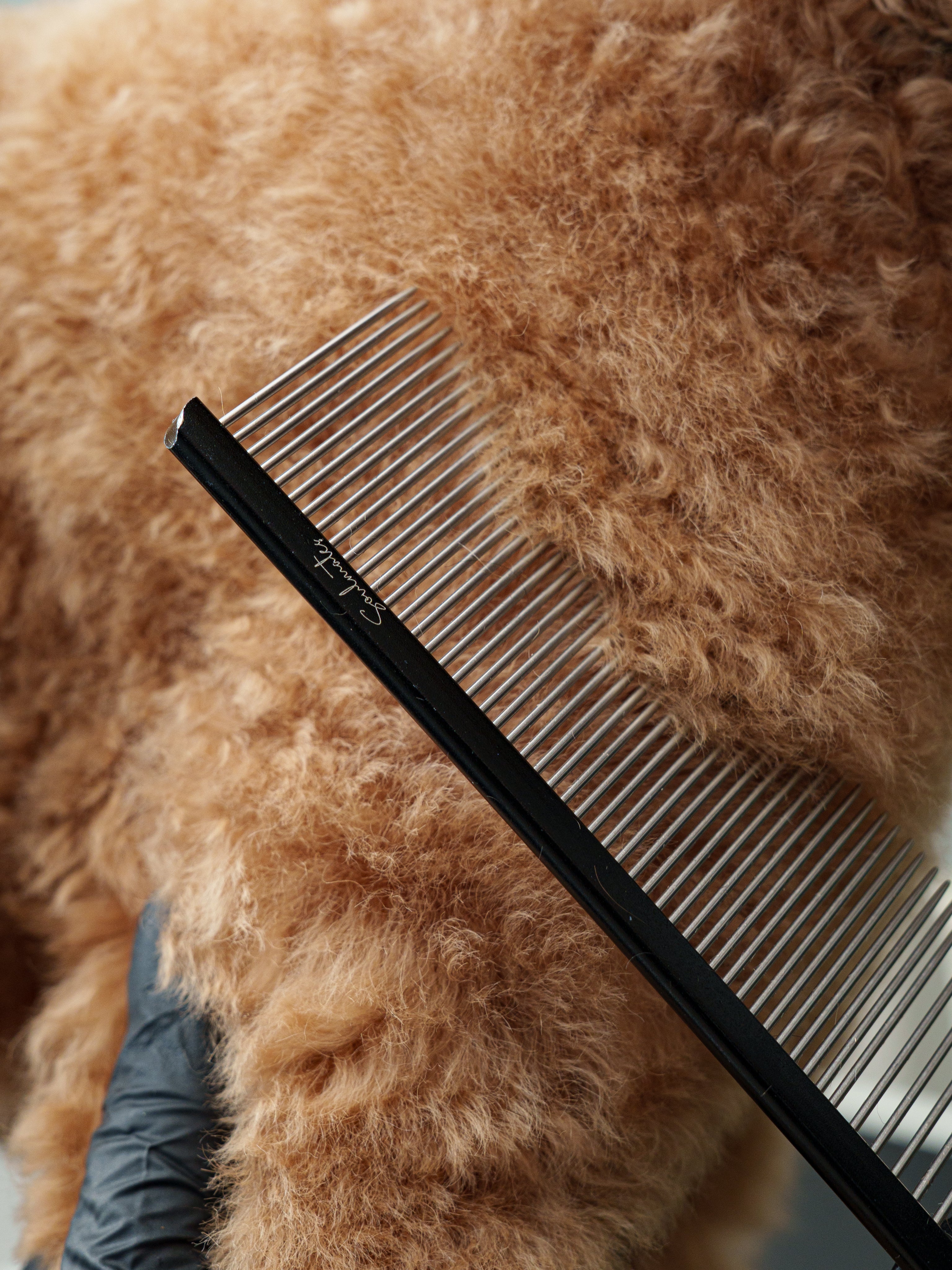 Gently comb your dog’s coat, starting with the wider teeth to lift and detangle, then use the finer teeth to smooth and refine. Work in sections, remove hair from the comb after use, and store in a dry place.